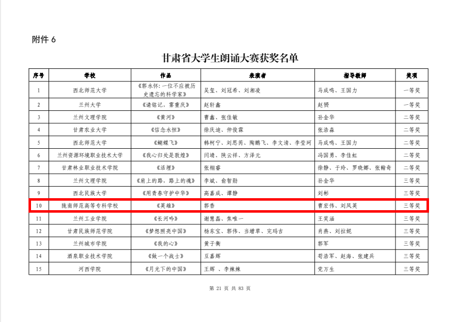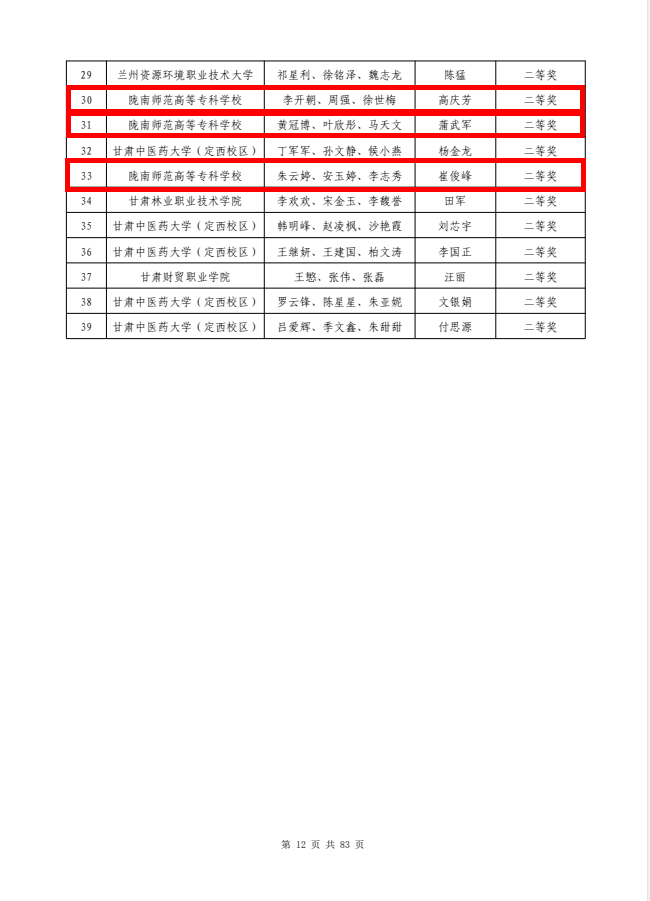 汪娟、杨智华、刘彤彤、郭雄伟荣获优秀指导教师称号。黎明、沈文静、马洋(指导教师:尚清芳),豆柏林、温朝辉、刘玟(指导教师蒲宝卿),李亚伟、李青峰、李傥(指导教师:李煜彦)3组荣获全国大学生数学建模竞赛(甘肃赛区)专科组特等奖;张勇虎、司马晓俊、朱林妤(指导教师:叶建龙),吕刚刚、尹子强、李丽霞(指导教师:苏文清),温璐璐、徐世涛、徐涛(指导教师:折远洋)3组荣获一等奖;钱珊珊、李希娇、郇秀(指导教师:侯英杰)等6组荣获二等奖。郭亚宁(指导教师:汪娟、杨智华),丁泰兴(指导教师:刘彤彤、郭雄伟)2组荣获甘肃省第二届“健心杯”大学生心理健康教育综合技能大赛教学组一等奖;张瑞(指导教师:刘彤彤、贺旭增),马雨(指导教师:马莉萍、武燚)2组荣获二等奖;段天惠(指导教师:马莉萍、何惠丽)荣获三等奖。郭香(指导教师:曹宏伟、刘凤英)荣获甘肃省大学生朗诵大赛三等奖。