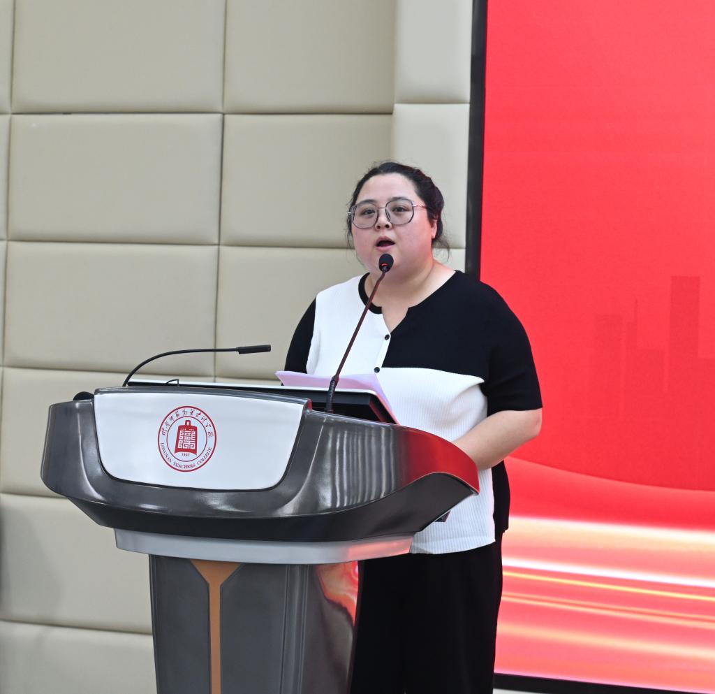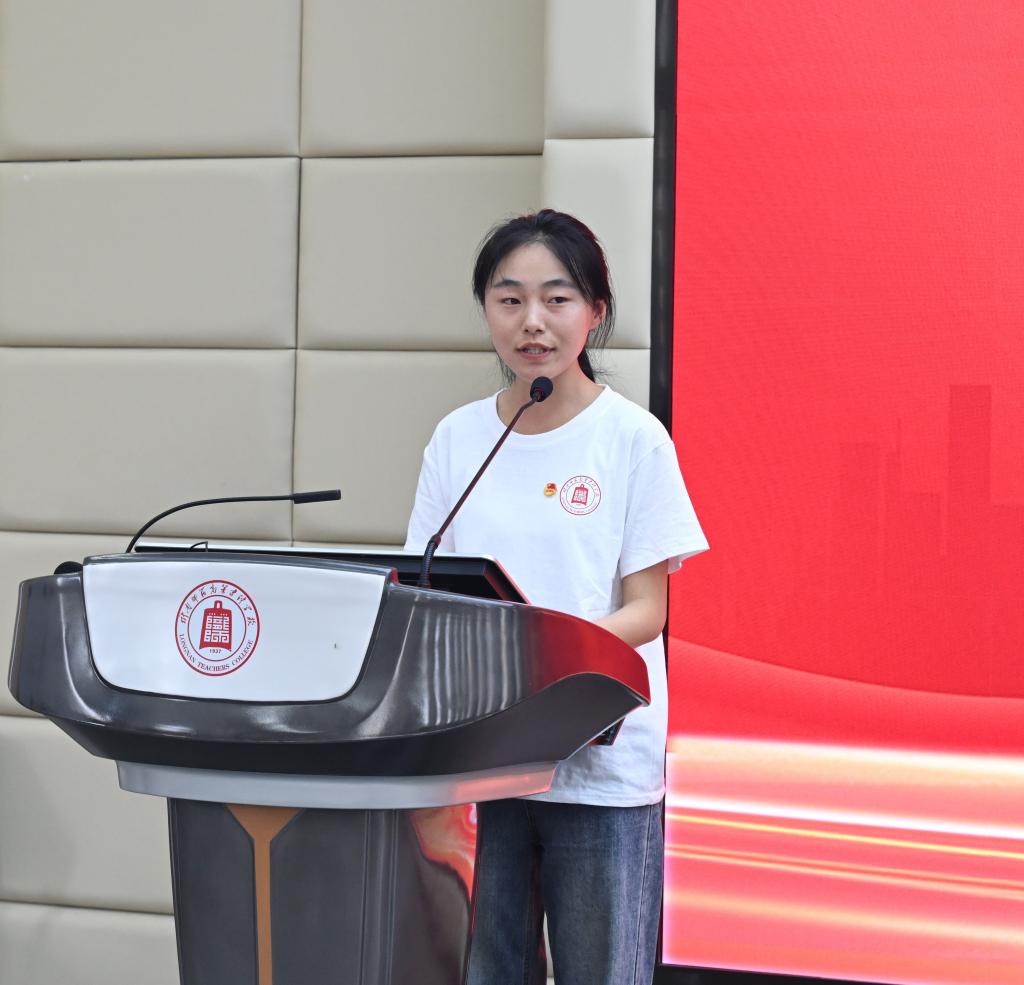 暑期社会实践团成员代表孙晶晶发言,承诺将严格遵守团队守则,制定并严格执行安全应急预案,力争圆满执行实践计划、完成实践任务,给社会、学校和自己一份满意的答卷。