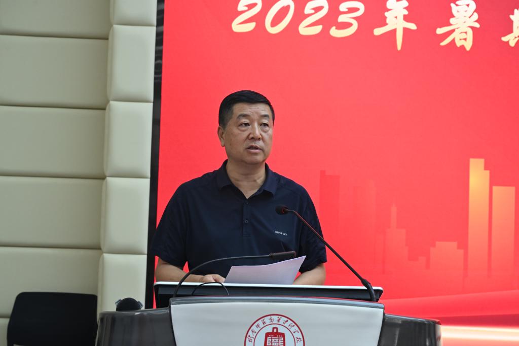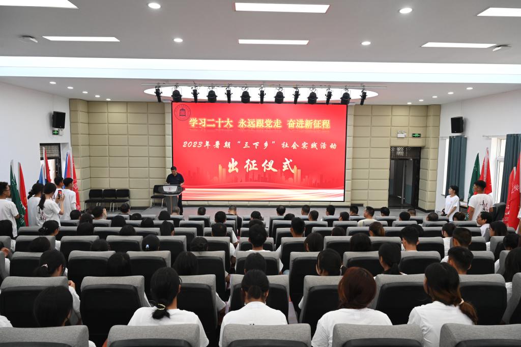 7月7日下午,学校举行2023年大学生志愿者暑期“三下乡”社会实践出征仪式,副校长任永峰出席仪式并讲话。宣传统战部、后勤处、教务处、学生处、财务处、保卫处和团委等相关处室负责人,学校暑期社会实践团队队员代表及指导教师共200余人参加了出征仪式。仪式由学生处负责人李晓江主持。