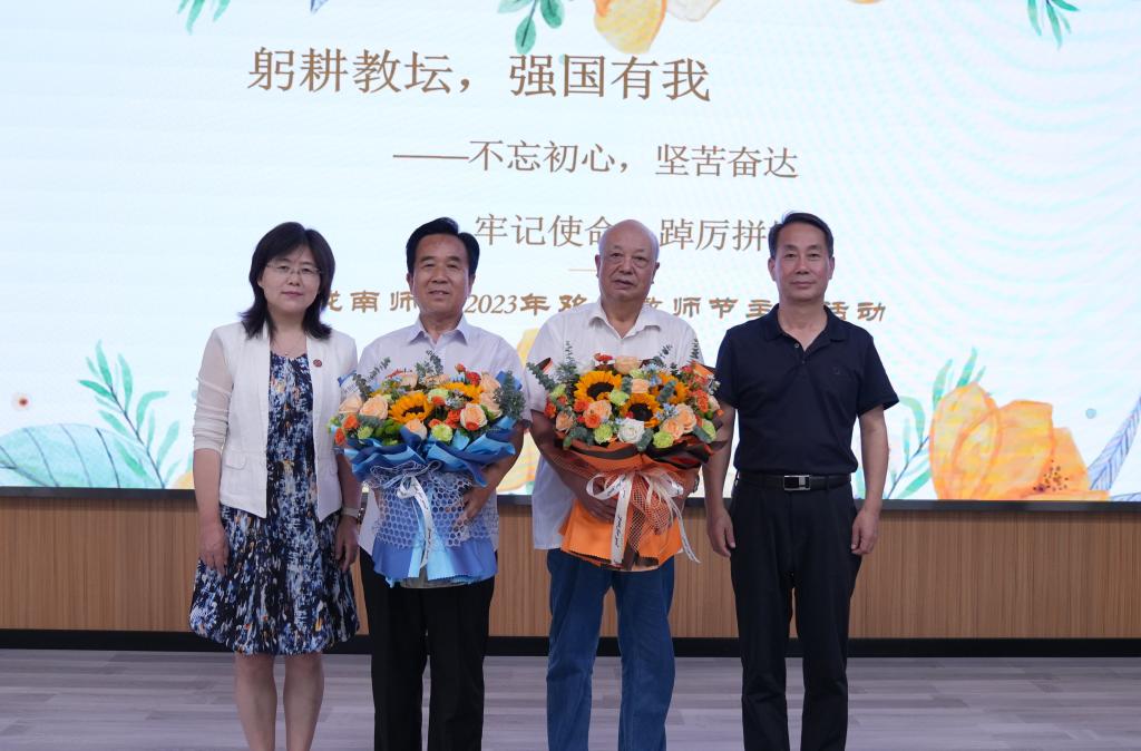 参会校领导还向退休教师代表献花,并合影留念。(文图/黑 蕾)