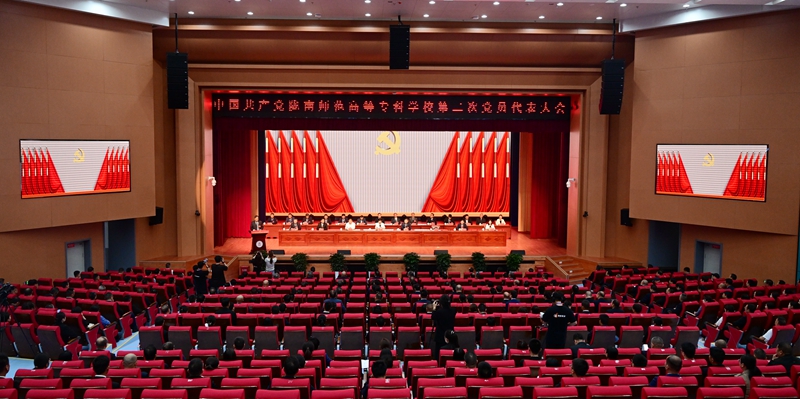 大会会场内外气氛庄严热烈。校园内鲜艳的道旗迎风飘扬,大会标语、成就展板整齐陈列,会场内主席台正中悬挂的中国共产党党徽熠熠生辉,10面鲜艳的红旗分列两侧。会场后方“坚持守正创新 勇担时代使命 努力开拓特色鲜明应用型师范学院建设新局面”的醒目标语,鼓舞人心、催人奋进。