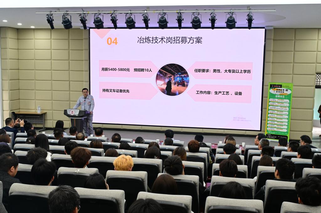 会上,吴冈冈和公司相关人员详细介绍了企业的发展历程、业务范围、核心产品、企业文化以及未来规划,阐述了此次招聘的岗位需求、任职要求、薪资待遇及职业发展路径等,让同学们对企业有了全面深入的了解。吴冈冈表示,此次招聘涵盖冶炼工、机修工、余热发电学员、化验员、电工、仪表工、采购专员、财务会计等多个岗位,期望吸纳活力足、专业强的毕业生,为企业发展注入动力,希望通过此次招聘宣介会,与学校建立紧密的合作关系,实现优势互补,为行业输送更多高素质的应用型人才。