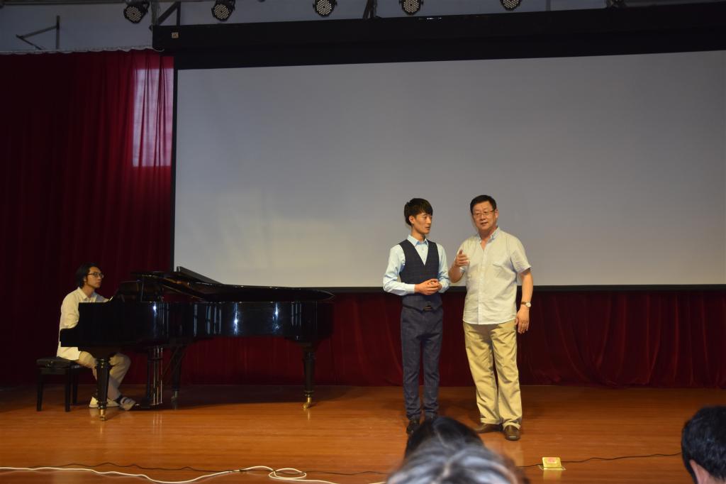 晚上,在北校区礼堂举行了“仲夏之声——朱东生教授学生音乐会”。朱东生教授的两位研究生李时雨、崔秋月演唱了《凤求凰》《梨花颂》《玫瑰三愿》《青春舞曲》《L’altra note in fondo al mare》等歌曲。