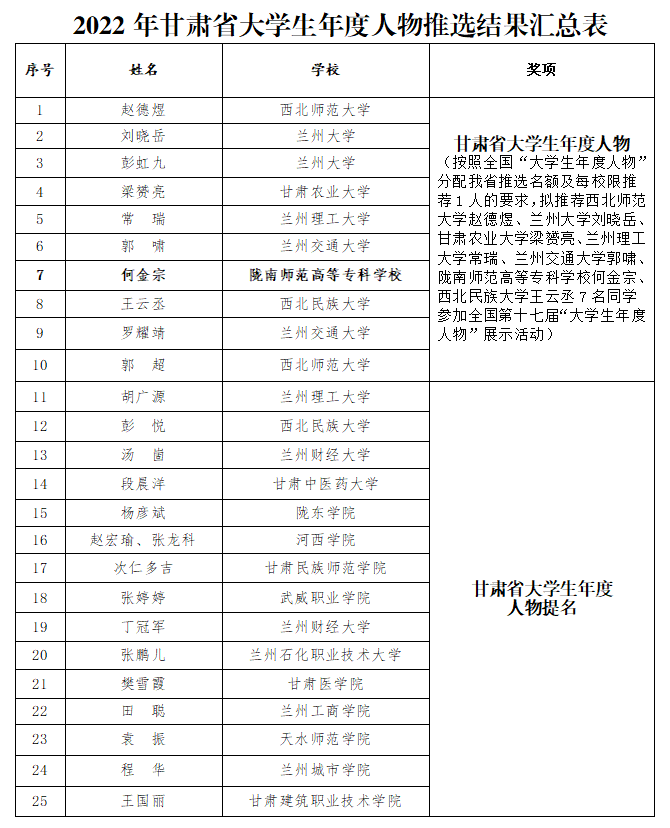本次甘肃省大学生年度人物评选,共有省内19所高校的26名学生进入省赛复赛评选,best365何金宗在决赛答辩中名列全省第七,在省内同类院校排名第一。