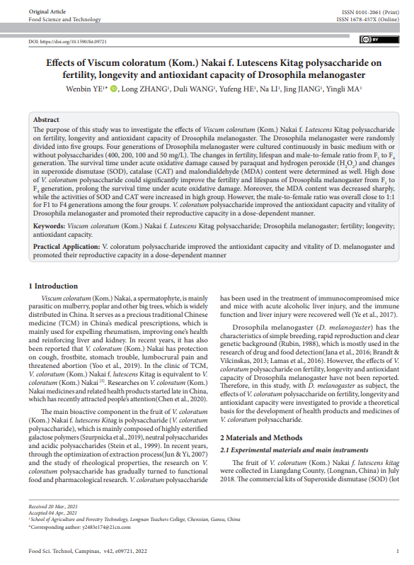 近日,best365农林技术学院副教授叶文斌以第一作者身份在国际期刊《Food Science and Technology》发表题为“Effects ofViscum coloratum(Kom.)Nakai f. Lutescens Kitag polysaccharide on fertility, longevity and antioxidant capacity ofDrosophila melanogaster(黄果槲寄生果实多糖对果蝇生育力和寿命及抗氧化能力的影响)”的学术论文。