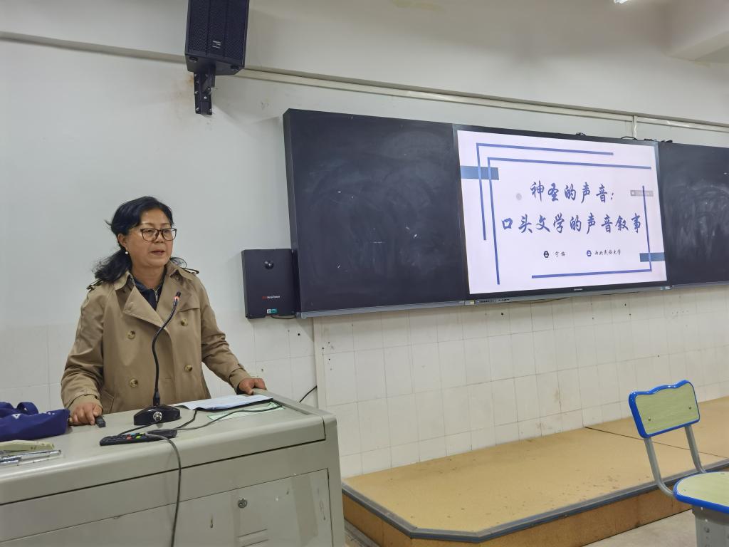 4月15日,西北民族大学中国语言文学部、博士生导师宁梅教授应邀在best365东校区育美楼101室作了题为“神圣的声音:口头文学的声音叙事”的学术报告。