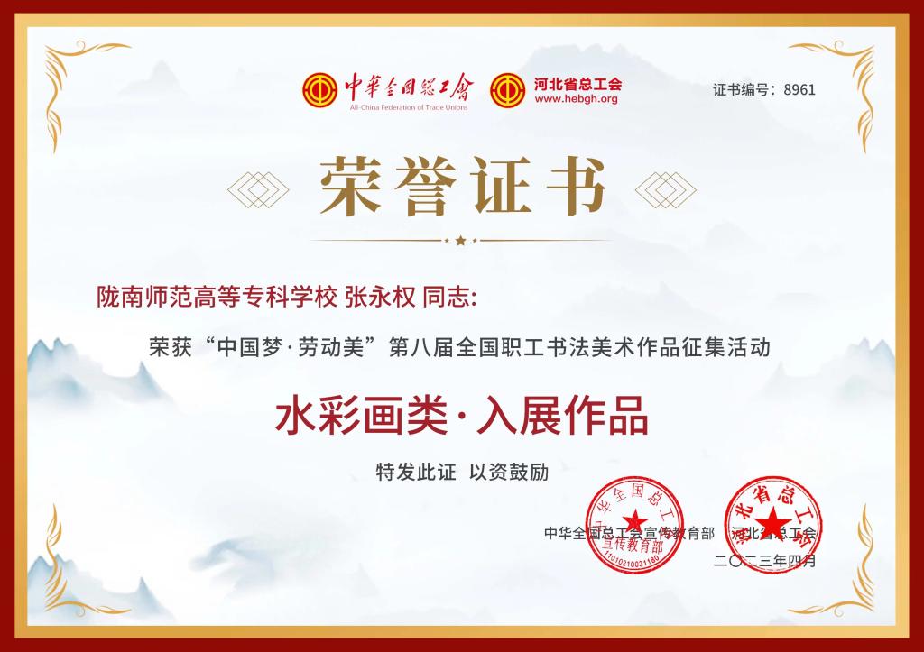 近日,由中华全国总工会宣传教育部、河北省总工会主办,中国职工书法家协会、唐山市总工会承办的“中国梦·劳动美”第八届全国职工书法美术展作品终评结果揭晓。best365学前教育学院张永权教授水彩画《负重前行》(118cmX78cm)在全国上万件作品中脱颖而出,荣誉入展。