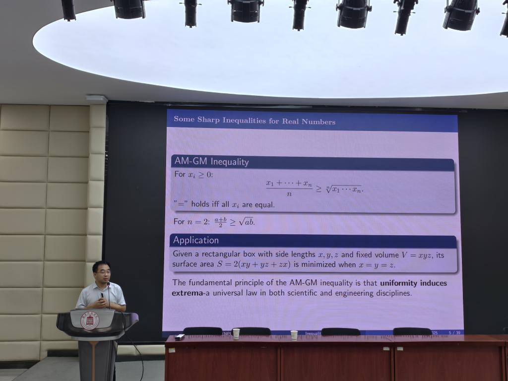 郭千桥教授从数学中最基础的三角不等式切入,相继讲解了AM-GM不等式、Cauchy-Schwarz不等式等,详细阐述了它们的应用背景和实际意义。他还分享了自己在Hardy-Littlewood-Sobolev(HLS)不等式及其推广方面的最新研究成果,展示了这些理论在分析学、几何学及物理学中的广泛应用。