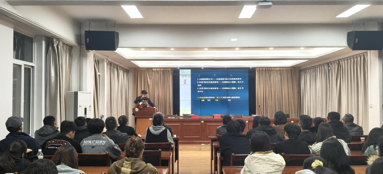 讲座中,蔡副全教授结合自身经历,从陇南金石研究切入,详述陇南深厚地域文化,分享发掘西狭颂摩崖石刻、考证题壁等科研故事;还讲解从陇南金石转向西北简牍研究的转型历程,以及“西北边塞汉晋简牍纸文书书法风格与流变研究”项目申报经验,并结合自身科研实践,对论文撰写和项目申报进行指导、分享实用经验,强调跨学科研究与科研教学融合的重要性。