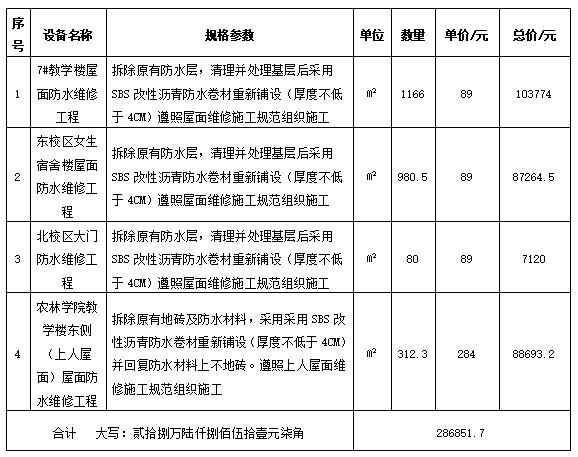 二、项目名称:陇南师范高等专科学校7#教学楼、东校区女生宿舍、北校区大门、农林学院教学楼东侧屋面防水维修施工项目
