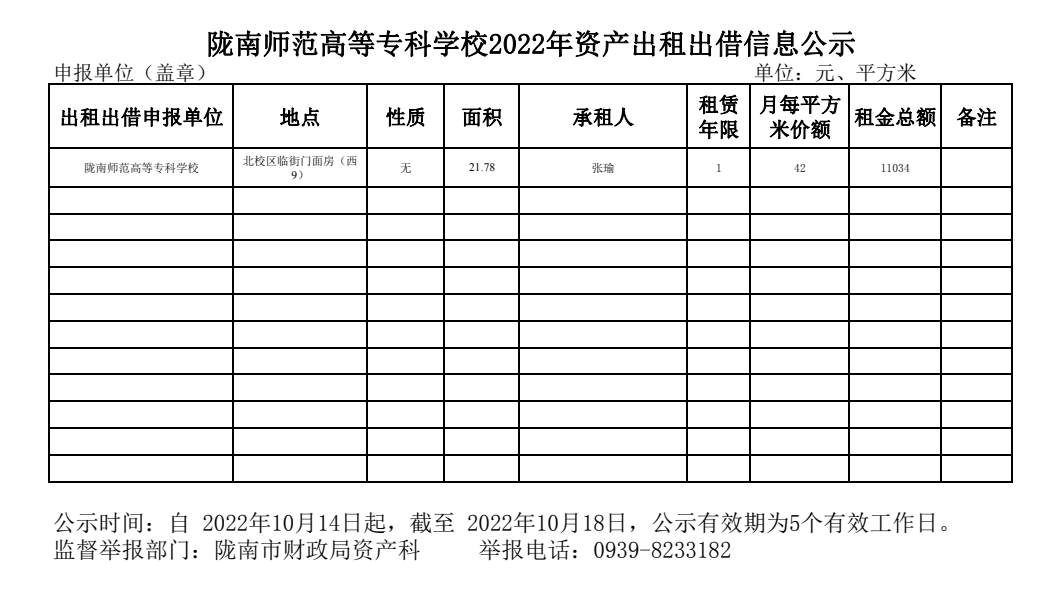 下一条:陇南师范高等专科学校2022年资产出租出借信息公示