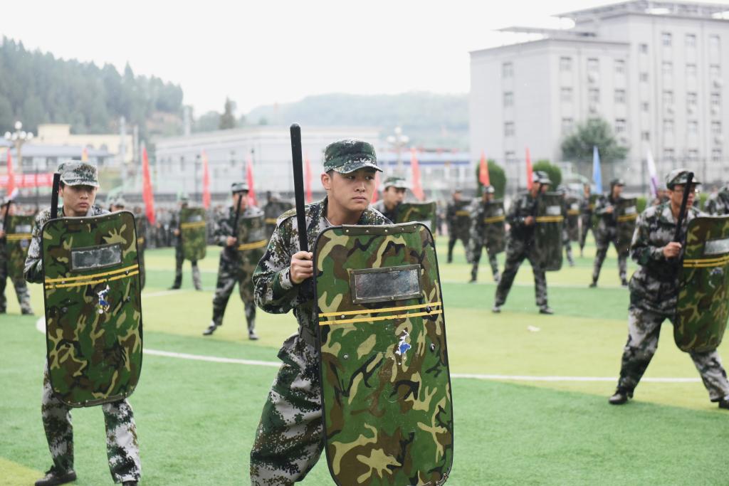 分列式军训会操表演结束后,文化队列、刺杀操、警棍盾牌操、女子匕首操、擒敌、战术和教官倒功操方阵轮番上场表演。嘹亮的喊声在操场上此起彼伏、久久回荡,每套动作都迅速有力,一招一式尽现陇师学子的豪迈气魄、展现了新一代陇南师专学子奋发昂扬的斗志和永不放弃的追求,现场高潮迭起,掌声雷动。