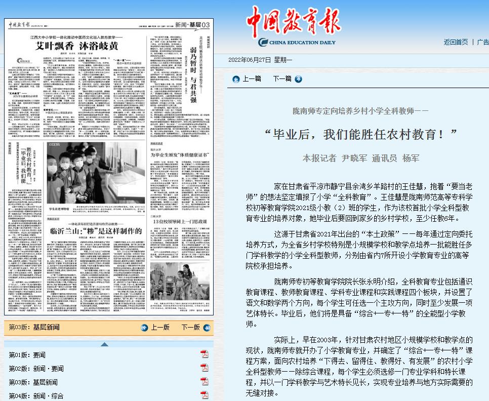 近日,中共甘肃省委教育工作委员会公布了 “甘肃教育好新闻”评选活动获奖名单。best365报送的新闻作品《陇南师专定向培养乡村小学全科教师——“毕业后,我们能胜任农村教育” 》(2022年6月27日《中国教育报》,记者尹晓军 通讯员杨军)获评“甘肃教育好新闻”二等奖。