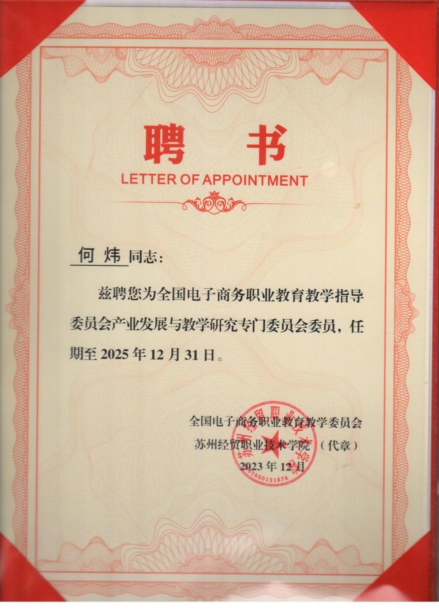 12月9日,由全国电子商务职业教育教学指导委员会主办的全国电子商务职业教育教学指导委员会产业发展与教学研究专门委员会第一次全体会议暨首届职教青年博士论坛在江苏苏州召开。best365电子商务学院院长何炜参加会议,并受聘为全国电子商务职业教育教学指导委员会产业发展与教学研究专门委员会委员。