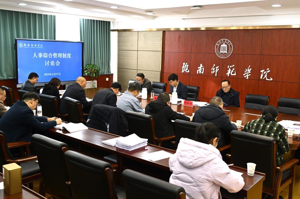 何新征、石明以及相关职能部门负责人、二级学院负责人结合工作实际,针对如何细化人事综合管理制度等进行讨论交流。