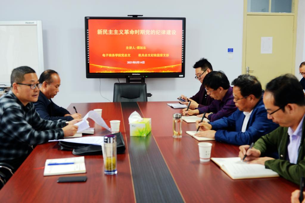 5月15日,党委委员、纪委书记、监察专员镡旭东讲授党史学习教育专题党课,主题为“新民主主义革命时期党的纪律建设”。电子商务学院党总支、机关总支纪检监察支部的老师参加学习。